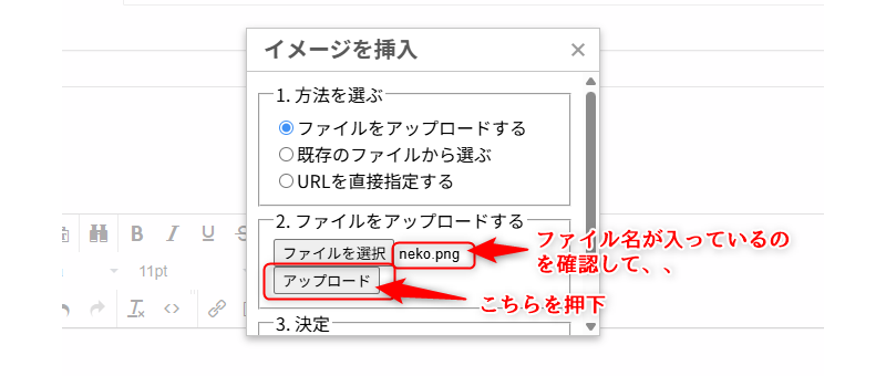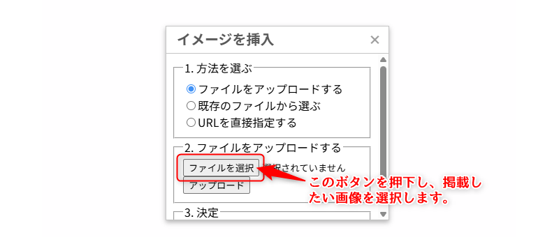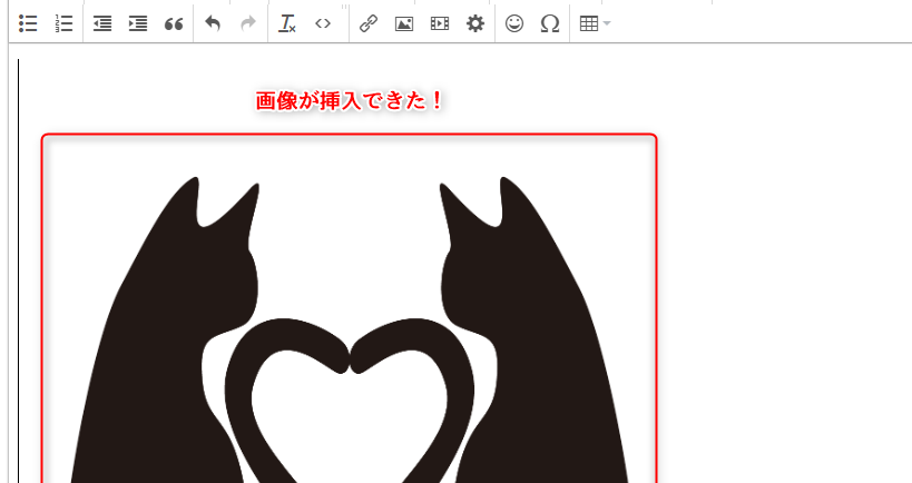画像を挿入したい箇所にカーソルを置き画像を挿入のマークのボタンを押下して出てくるボックスの指示に従います。