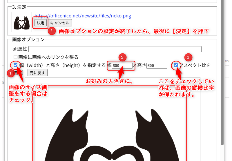 2. 画像オプションで幅を変更する。(800くらいがベスト)高さは、特に入力しなくてもアスペクト比が維持されるので大丈夫です。