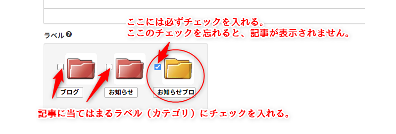 デフォルトでチェックの入っている「お知らせブログ」はそのままで、書いた記事に当てはまるラベル(お知らせorブログ)にチェックを入れます。
