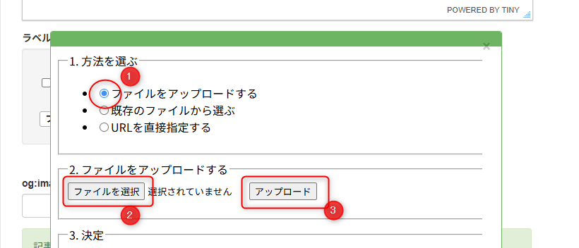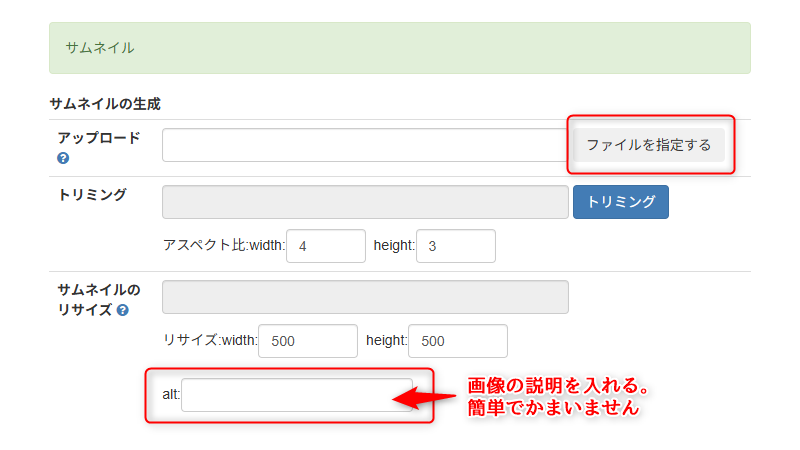 メインで掲載する画像をアップロードします。「ファイルを指定する」ボタンから、og:imageの時と同じように画像をアップロードし、altに画像の説明を記載します。※「トリミング」・「サムネイルのリサイズ」は、空欄のままで大丈夫です。