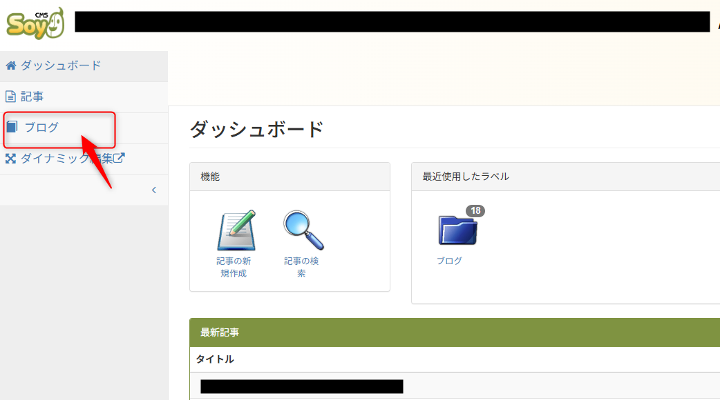 ログイン後に表示されるダッシュボードのサイドバーから「ブログ」を選んで入室します。