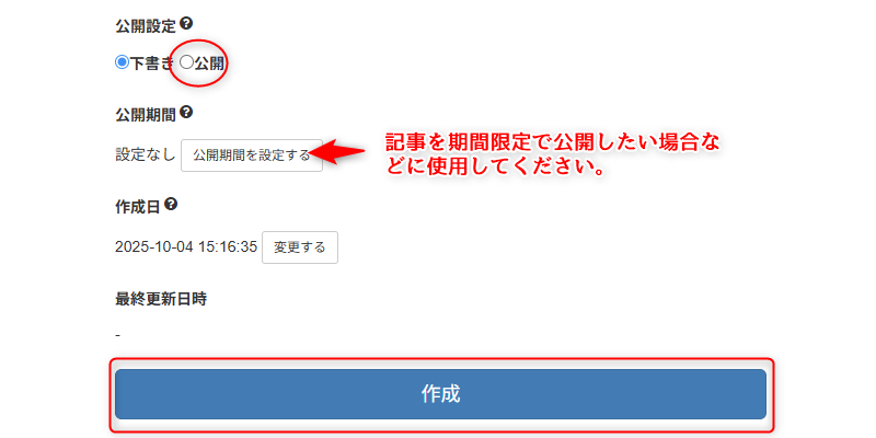 公開設定の箇所を「公開」にし、下の作成ボタンをクリック。