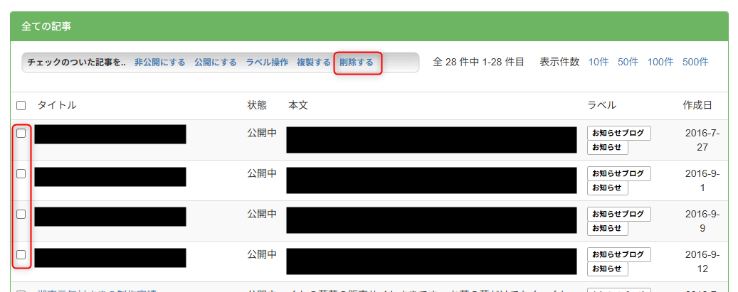 記事一覧から削除したい記事にチェックを入れ、「削除」をクリックします。