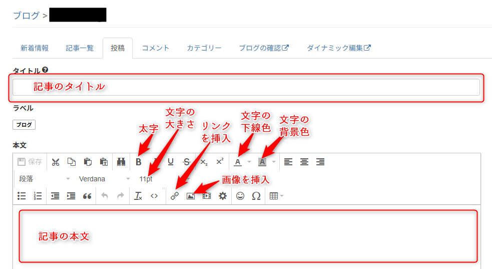記事の投稿画面が表示されますので、下記の様に入力していきます。